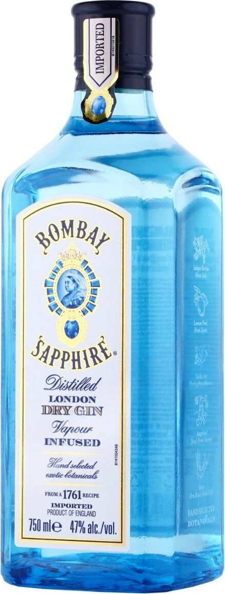 Джин Bombay Sapphire представляет собой британский сухой джин из Лондона, произведённый под маркой Bombay Sapphire. В основе рецептуры лежит традиционный набор ботанических компонентов: ягоды можжевельника, кориандр, лимонная и апельсиновая кожура, корень дудника, горький миндаль, корень кубебы, кора кассии, райские зерна и лакрица, причём растения отбираются из разных регионов мира. Производство включает двойную дистилляцию шотландского пшеничного спирта и последующую дистилляцию через медные кубы с растительной смесью, что обеспечивает концентрированность ароматического букета и придаёт напитку характерную мягкость; в финале используется кристально чистая вода из озера Вринви. Бутылка имеет оригинальный полупрозрачный голубой дизайн, напоминающий сапфир. Аромат сочетает можжевеловые и цитрусовые тона с пряной базой, вкус сбалансирован и подходит для создания классических коктейлей, где джин раскрывается цитрусовыми и пряными оттенками. Напиток отмечен в наградах и позиционируется как премиальный джин.